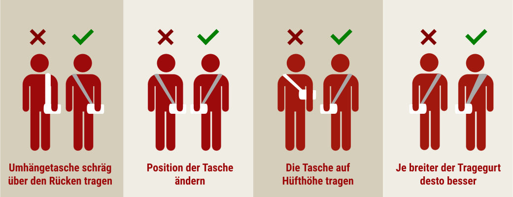 Um die Last besser auf den Körper zu verteilen, sollten Sie die Tasche nicht einseitig tragen, sondern schräg über den Rücken.